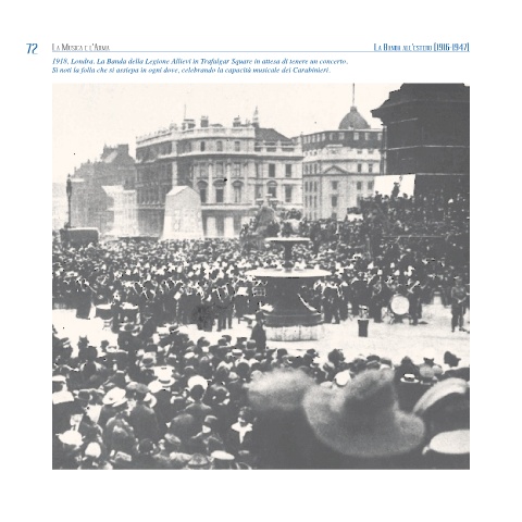 72 La Musica e L'arMa La Banda aLL'estero (1916-1947) 1918, Londra. La Banda della Legione Allievi in Trafalgar Square in attesa di tenere un concerto. Si noti la folla che si assiepa in ogni dove, celebrando la capacità musicale dei Carabinieri.