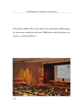 CONFERENZE E SEMINARI SCIENTIFICI L’11 gennaio 2018, il Prof. Gian Maria Fara, Presidente dell’Eurispes, ha tenuto una conferenza dal titolo “Riflessione sulla situazione eco- nomica e sociale del Paese”. 232