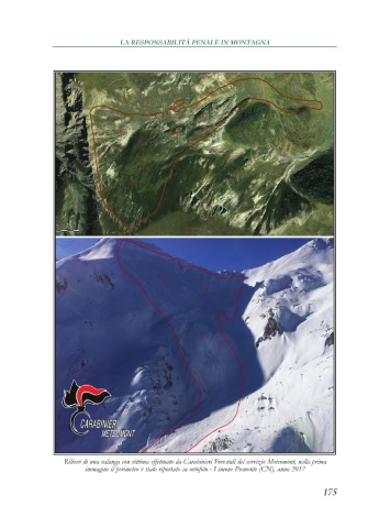 LA RESPONSABILITÀ PENALE IN MONTAGNA Rilievo di una valanga con vittima effettuato da Carabinieri Forestali del servizio Meteomont, nella prima immagine il perimetro è stato riportato su ortofoto - Limone Piemonte (CN), anno 2017 175