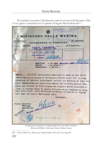Telegramma contenente le disposizioni per il varo del Carabiniere
