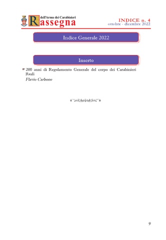 R assegna ottobre - dicembre 2022 dell’Arma dei Carabinieri INDICE n. 4 Indice Generale 2022 Inserto 200 anni di Regolamento Generale del corpo dei Carabinieri Reali Flavio Carbone 9