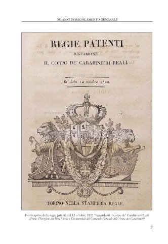 200 ANNI DI REGOLAMENTO GENERALE Frontespizio delle regie patenti del 12 ottobre 1822 “riguardanti il corpo de’ Carabinieri Reali (Fonte: Direzione dei Beni Storici e Documentali del Comando Generale dell’Arma dei Carabinieri) 7