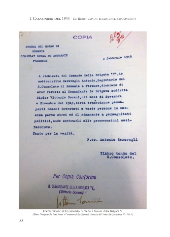 I CARABINIERI DEL 1944 - LE RESISTENZE AL REGIME COLLABORAZIONISTA Dichiarazione del Consolato rumeno a favore della Brigata V (Fonte: Direzione dei Beni Storici e Documentali del Comando Generale dell’Arma dei Carabinieri, D1219.2) 88