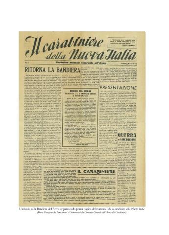 L’articolo sulla Bandiera dell’Arma apparso sulla prima pagina del numero I de Il carabiniere della Nuova Italia (Fonte: Direzione dei Beni Storici e Documentali del Comando Generale dell’Arma dei Carabinieri)
