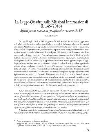 Italian Law no. 145 of July 21, 2016, also known as the «framework law on international mis-