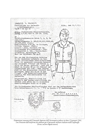 disposizioni emanate dal comando supremo dell'aeronautica tedesca in data 12 gennaio 1945, con il bozzetto dell'uniforme da adottare per il personale militare italiano nella luftwaffe (Fonte: archivio digitale autore)