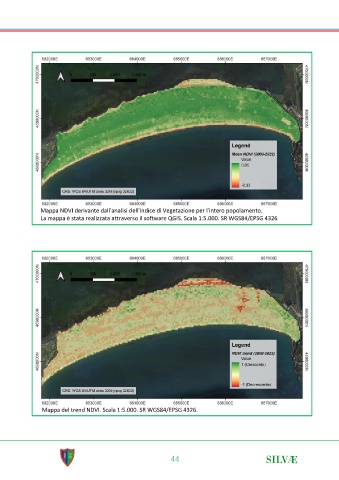 Mappa NDVI derivante dall'analisi dell'indice di Vegetazione per l'intero popolamento. La mappa è stata realizzata attraverso il software QGIS. Scala 1:5.000. SR WGS84/EPSG 4326 Mappa del trend NDVI. Scala 1:5.000. SR WGS84/EPSG 4326. 44
