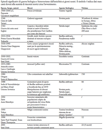Nonostante il termine bioterrorismo costituisca un neologismo degli anni ‘90 del secolo scorso, la guerra biologica e l’impiego delle armi biologiche sono fenomeni documentati fin dalle epoche più antiche, proprio in ragione della loro premessa capacità di colpire numerosi individui pressoché simultaneamente. La sottostante Tabella 1 riporta alcuni degli episodi storici più noti in cui hanno trovato impiego armi biologiche, tra cui si ricordano, in particolare: