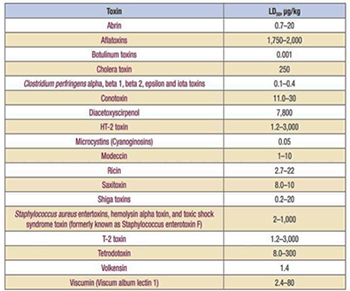 Tra le tossine identificate dai CDC quali ulteriori agenti biologici potenzialmente utilizzabili per scopi terroristici, le seguenti biotossine marine (vds. Tabella 5) e micotossine: