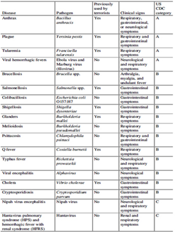 • Salmonella enterica, responsabile di una tipica forma di infezione alimentare, per consumo di alimenti e acqua contaminati; il tasso di letalità è del 12-30%, nonostante l’esistenza di uno specifico vaccino; non è malattia zoonotica, ma la trasmissione umana avviene per contatto diretto; il batterio è stato precedentemente utilizzato in atti di bioterrorismo (vds. Tabella 4);