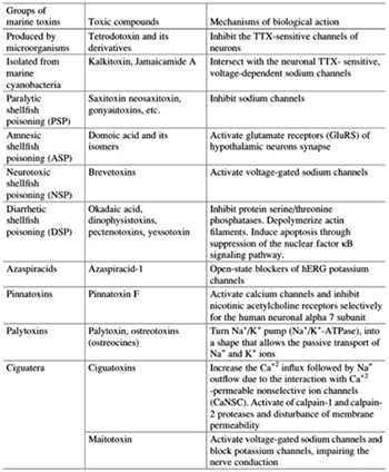 - tetrodotossina (TTX), rappresenta una delle più potenti tossine non proteiche, ampiamente distribuita nel mondo animale acquatico marino (soprattutto pesci della famiglia Tetraodontidae, tra cui 80 specie del c.d. pesce palla (30)); il meccanismo d’azione si estrinseca sui canali del sodio, determinando il blocco della conduzione dell’impulso lungo i nervi sensitivi e motori e, nei casi più gravi, l’insorgenza di una grave insufficienza respiratoria, aritmia cardiaca e morte;