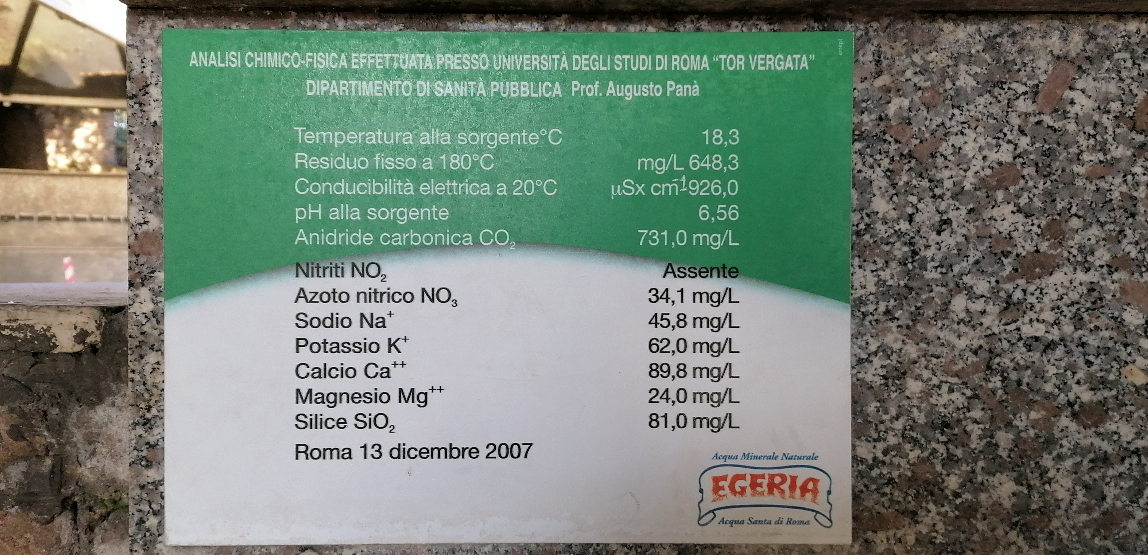 - Fonte Egeria: le caratteristiche chimico fisiche dell’acqua Santa di Roma, esposte nell’omonimo stabilimento di imbottigliamento.