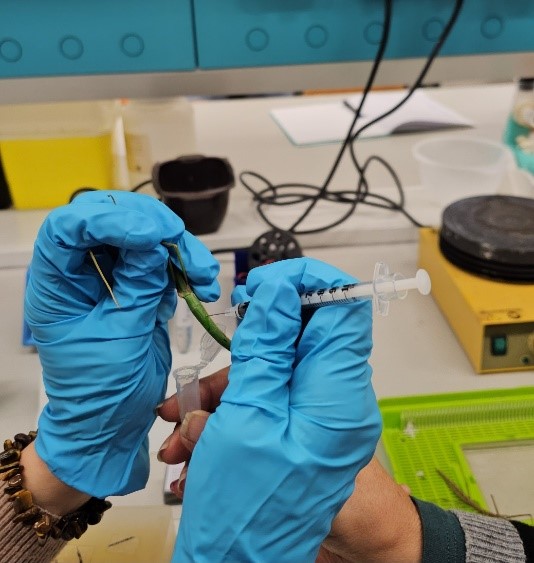 Foto 2: prelievo dell’emolinfa dall’insetto stecco. (Foto Ten. A. Pinto).