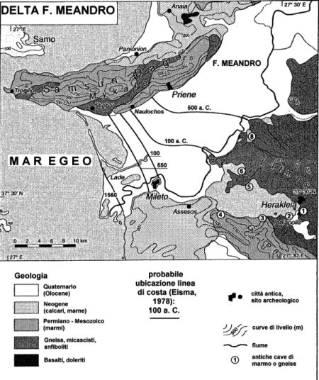Certamente il processo di sedimentazione citato ebbe un decorso più o meno lungo: Strabone (XII.8, 15-17) descrive, nel I sec. d. C., la sedimentazione nella pianura del Meandro intorno alla penisola di Mileto; Pausania (VIII.24.5) scrive, nella metà del II sec. d. C., che l’antica baia dove il Meandro sfociava nel mare Egeo era diventata una campagna con coltivi, attribuendo il fenomeno ai depositi alluvionali dello stesso fiume.