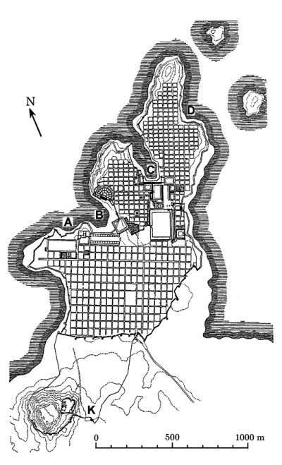 Fig 1 _Mileto – Planimetria generale del promontorio di Mileto. Si noti il tessuto urbano costruito alla estremità di un promontorio, e l’impianto ippodameo della città, secondo un rigido schema ortogonale. Si nota che la penisola è molto frastagliata ed ospita insenature più o meno profonde, che furono utilizzate come porti, fra cui quello del Leone (C), che si apre a NO. Nelle varie epoche si succedettero i vari insediamenti, e in particolare quello settentrionale fu arcaico, quello occidentale fu ellenistico, e quello meridionale fu greco-romano. Porti: A Porto di Atena; B Porto del teatro; C Porto dei Leoni; D Porto di Nord Est K collina di Kalabak.