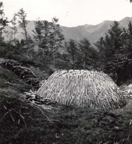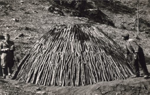 Figura 3: La “costruzione” e la fase di combustione realizzazione della carbonaia avveniva in epoca passata spesso sotto il controllo dell’Amministrazione Forestale dello Stato. (Foto: Archivio Comando Regione Carabinieri Forestale “Marche” – Ancona).