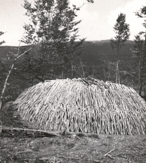 Figura 2: Una volta ultimata la “costruzione” della carbonaia, la stessa veniva ricoperta di terra reperita sul posto; si può notare l’inizio del ricoprimento sul lato sinistro osservando l’immagine. (Foto: Archivio Comando Regione Carabinieri Forestale “Marche” – Ancona)