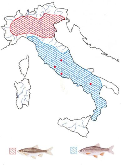 Figura 1. Areale del Triotto (in rosso) e della Rovella (in azzurro); i punti rossi indicano alcune popolazioni introdotte e naturalizzate di Triotto in Italia centro-meridionale.