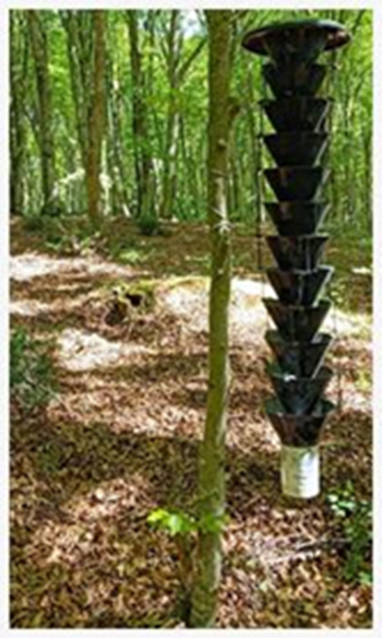 Le attività di campo si sono svolte tra febbraio e ottobre 2024. Sono state impiegate trappole multifunnel innescate con etanolo, attrattivo particolarmente efficace (RANGER et al., 2012) per gli ambrosia beetles (FRANCKE GROSMANN, 1975; FACCOLI, 2021). Le trappole sono state appese a circa due metri da terra e i campioni raccolti ogni 15 giorni (Figura 3). Sono costituite da una serie di 12 imbuti neri, di circa 20 cm di diametro, posizionati verticalmente e hanno alla base un cilindro di raccolta del campione dotato di retina basale, per permettere la fuoriuscita di acqua piovana. L’attrattivo è stato sostituito ogni due settimane per tutta la durata del monitoraggio, contestualmente alla raccolta dei campioni, avvenuta con la stessa frequenza. In totale sono state posizionate nove trappole. L’area è stata suddivisa in tre blocchi, in ognuno dei quali sono state collocate tre trappole secondo uno schema triangolare, posizionate l’una dall’altra a 70-80 m. Le analisi di laboratorio hanno incluso l’identificazione morfologica e il conteggio degli individui catturati.