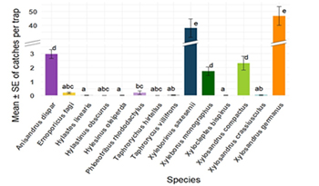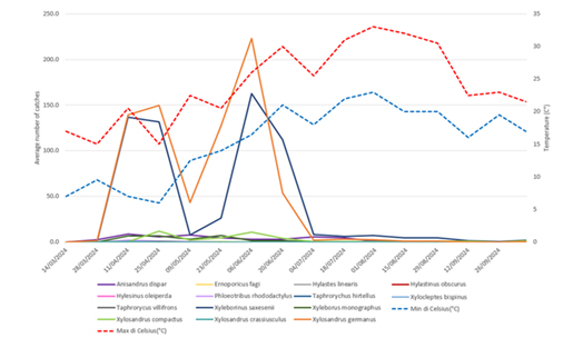 Sono state identificate 13 specie di coleotteri lignicoli. Dai risultati ottenuti tramite analisi statistica e con l’applicazione del “software r”, tra le più abbondanti si segnalano Xylosandrus germanus, con picchi di volo tra maggio e luglio, e Xyleborinus saxesenii, presente in tutto il periodo e mostrano un numero di catture statisticamente maggiore rispetto alle altre specie (p<0,05) (Figura 5). Anisandrus dispar ha mostrato una distribuzione irregolare ma significativa. La presenza di Taphrochychus bicolor è risultata correlata al deperimento degli alberi, probabilmente associata a siccità prolungata.