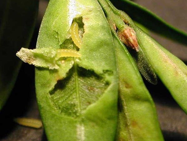 Le larve si presentano di colore bianco o gialle e come vedete nella foto in basso si annidano all’interno delle foglie, causandone il deperimento.