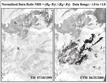 Figura 3: Esempio di variazione dell’indice NBR pre e post incendio (da KEY e BENSON, 2006).